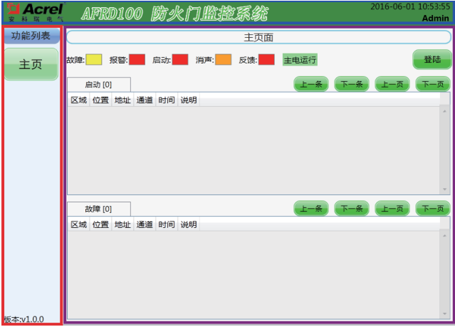 包含“登陆”按钮、“界面标题”、“功能列表”、“系统状态栏”四部分组成,可以快速查询当前监控状态,也可用于工作人员登录操作。