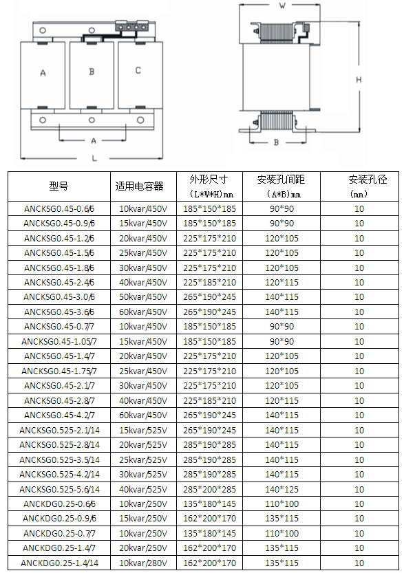 ANCK系列串联电抗器与ANBSMJ系列自愈式低压并联电容器配套使用,主要用于提高0.4kV电力系统的功率因数,有效抑制电网的高次谐波,减轻电容器由谐波引起的过载,防止谐波放大,对电容器的安全运行,改善网络电压波形,提高供电质量和电网安全经济运行起良好作用。