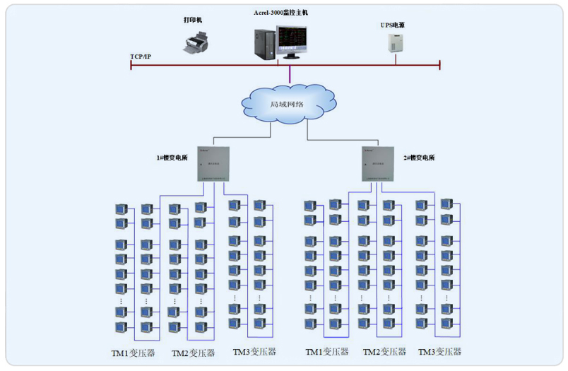 广饶尚能时代项目引入两路10KV市电,在1#楼设10KV高压配电室。1#楼有3台10KV/0.4KV变压器:TM1容量为500KVA,TM2容量为500KVA,TM3容量为1000KVA;2#楼有3台10KV/0.4KV变压器:TM1容量为630KVA,TM2容量为500KVA,TM3容量为1000KVA。后配出至各楼层配电箱,用于空调、照明、动力、特殊等用电。安科瑞电气股份有限公司于2017年7月承接了广饶尚能时代项目电能管理系统的设计与实施,旨在通过该系统实现广饶尚能时代项目用电的集中管理和检测,实现远程智能化配电。