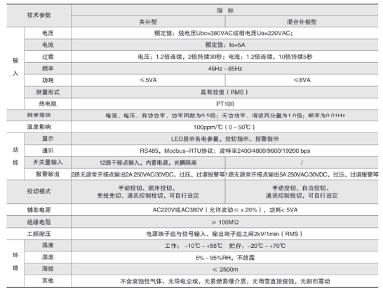 技术要求:输入三相电压AC220V;输入电流AC5A;投切方式顺序投切;补偿方式三相共补;投切控制路数6路;开关量输入6路;柜内温度检测。