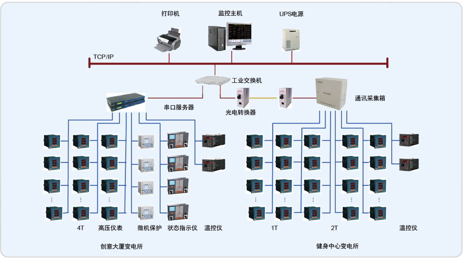 本项目监控范围为健身中心变电所的T1、T2变压器的低压进线柜、联络 柜、馈线柜和创意大厦变电所的T3、T4变压器的低压进线柜、联络柜、馈线柜及高压侧仪表进行远程实时监控和电能管理直线距离约230米。
