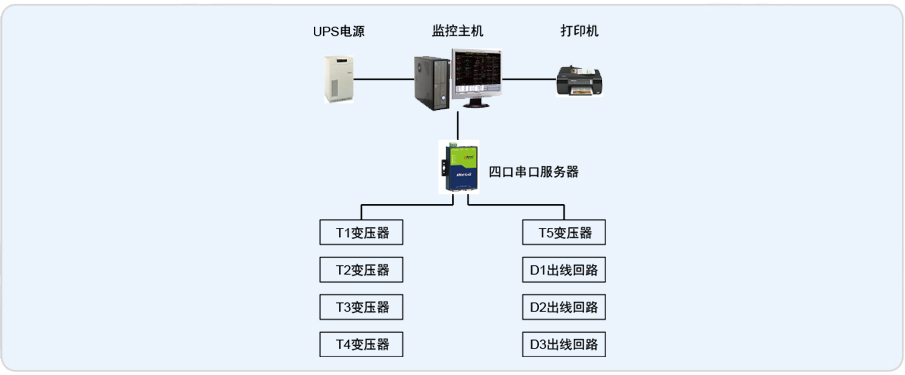 本项目为武汉爱机汽车配件有限公司变电所改造项目。根据配电系统管理的要求,需要对武汉爱机汽车配件有限公司3个变电所内的8个低压配出线进行电力监控,以保证用电回路的安全、可靠和高效的运行。监测范围具体为T1、T2、T3、T4、T5、D1、D2和D3共8个变压器的进线柜侧仪表进行远程实时监控和电能管理。该系统总计有8只仪表,分2条总线,都是直接通过屏蔽双绞线走管道拉至值班室连接到串口服务器上,实现总线上仪表与监控主机的数据连通。