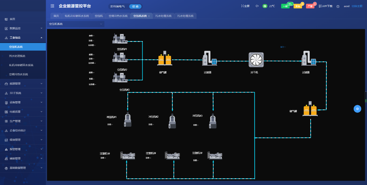 ※ 能源实时监控:对于水、电、气等能源消耗进行实时监测,确保用能环节的安全持续稳定运行,显示配电图、能流图、能源平衡网络图、能源计量网络图等功能。