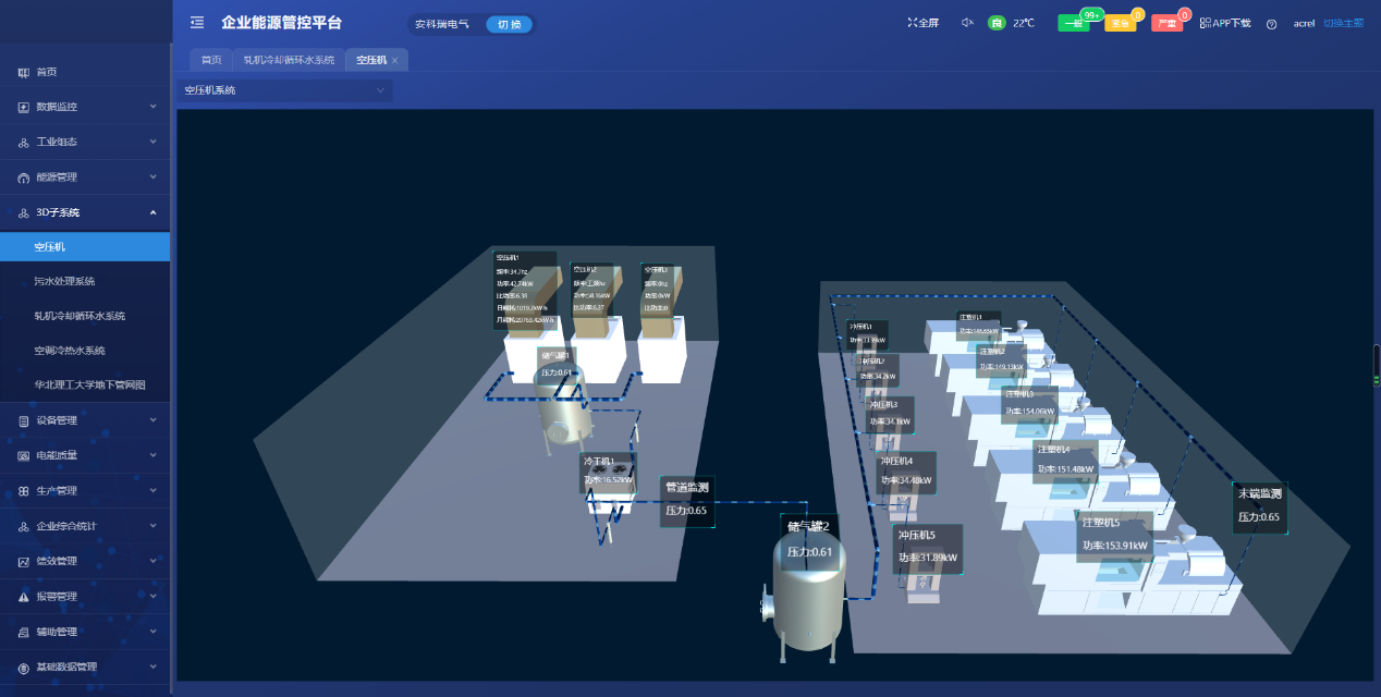 对企业各点位的能源使用、报警等情况进行实时的监控。以便企业用户能够实时的监测各个点位的运作情况,同时能更快速高效的掌握点位的报警,并为企业削峰填谷、调整负载等技改措施提供数据支撑。